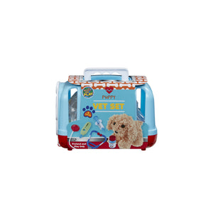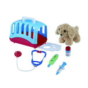 Delight dog lovers and aspiring veterinarians with The My World My Play Puppy Vet Set. Including everything a vet-to-be needs to practice treating a sick puppy, this set comes with 6 pieces - a colorful pet carrier made of durable, nontoxic plastic, an adorable fuzzy little brown plush dog and 5 toy vet items made of plastic including a syringe, stethoscope, thermometer, and medicine bottle. A perfect set for bringing puppy to a make-believe vet. Packaged in eye-catching, colorful wraparound cardboard decorated with photos of the puppy and vet items. 7.5 L x 5.3 W x 5.7 H inches.